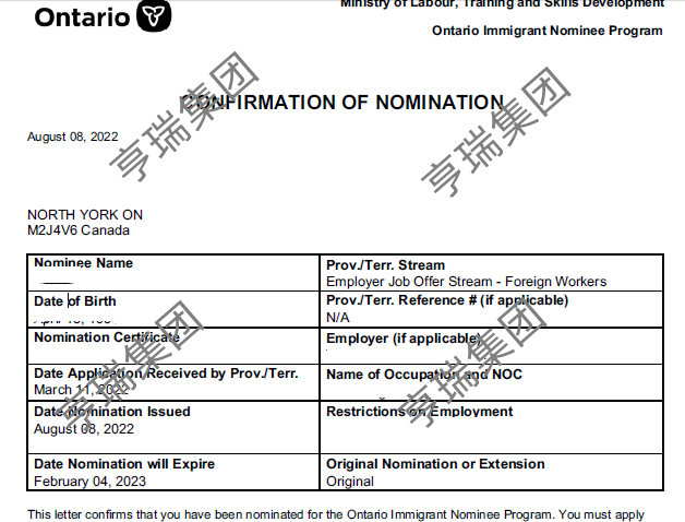 近日, 亨瑞集团安省雇主担保项目再度传来喜讯:客户P先生获批省提名。