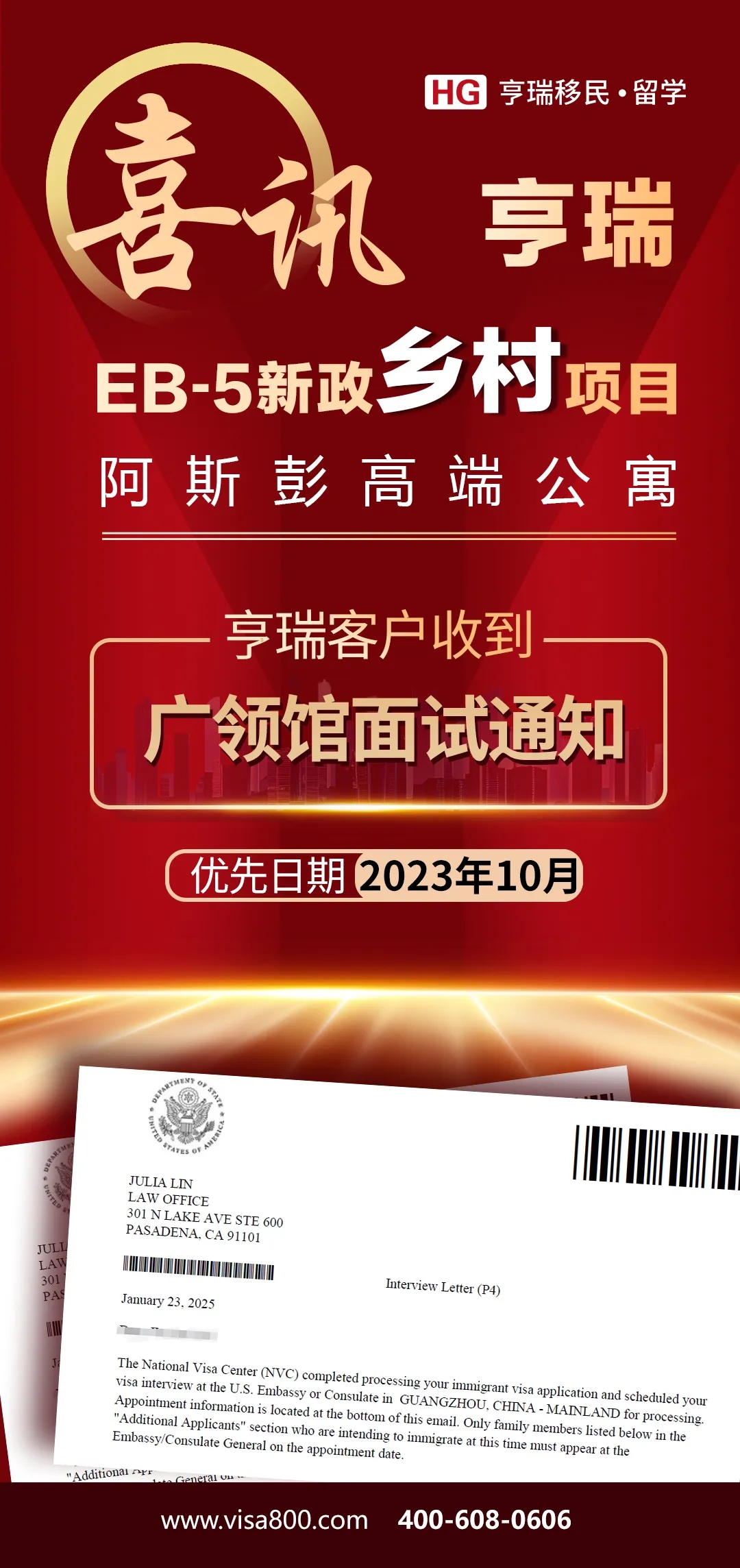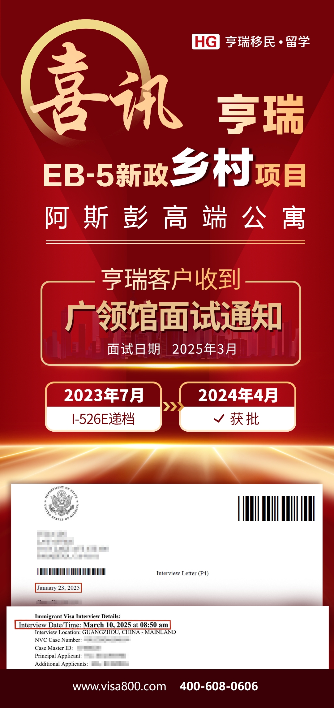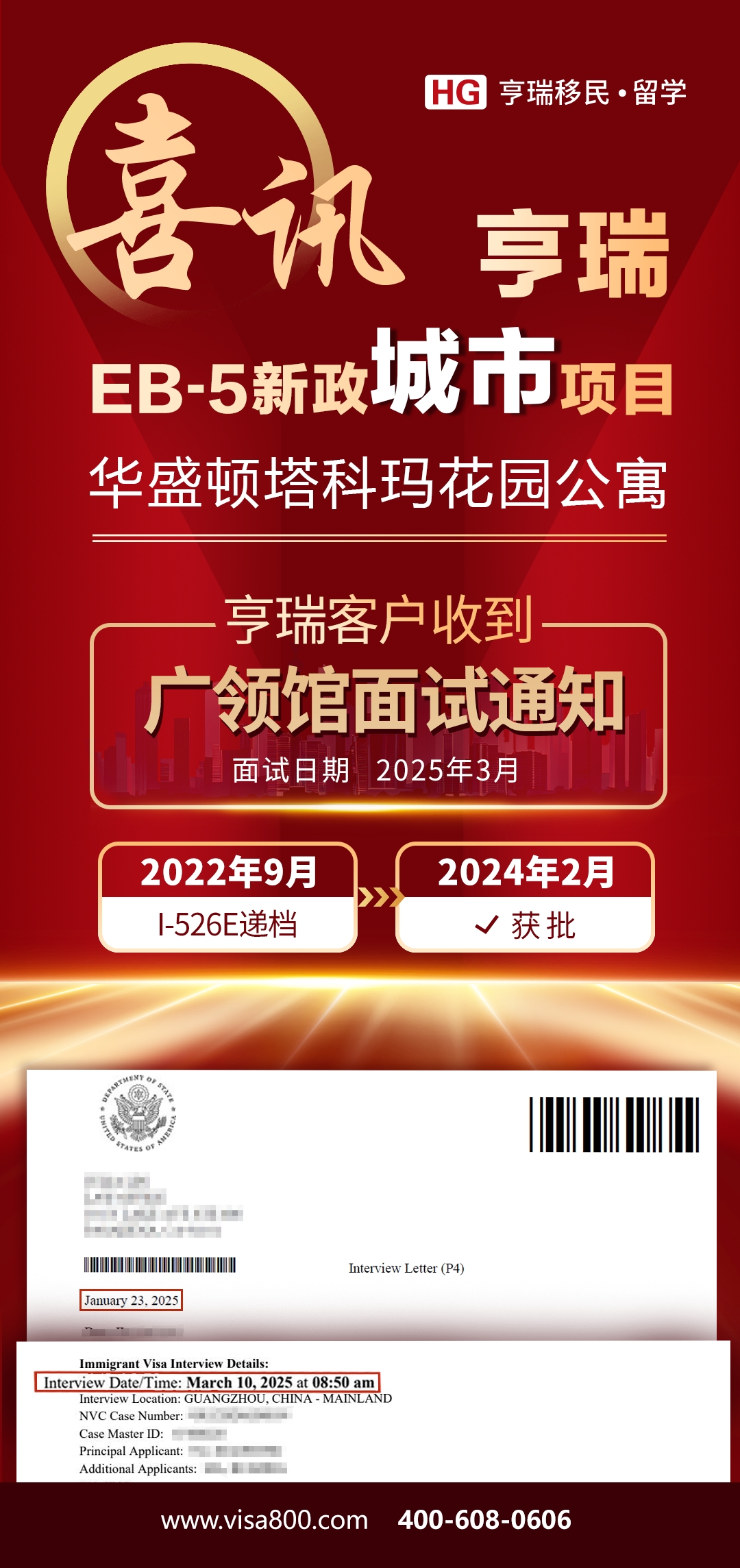 喜乐元宵节,亨瑞又有一波新法下的EB-5面试通知翩然而至。我们欣喜地通知各位投资人:我们近期陆续收到了多份2025年3月份的EB-5移民签证面试通知!