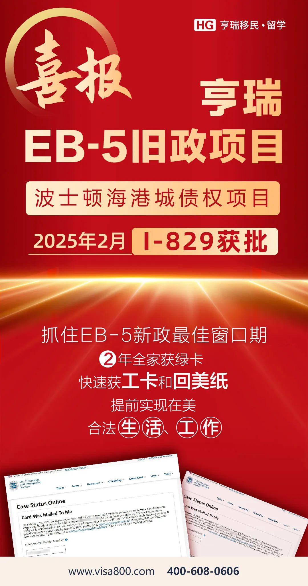 近日,亨瑞集团又一EB-5项目——波士顿海港城债权项目获批I-829!该项目已有投资人喜获永久绿卡!