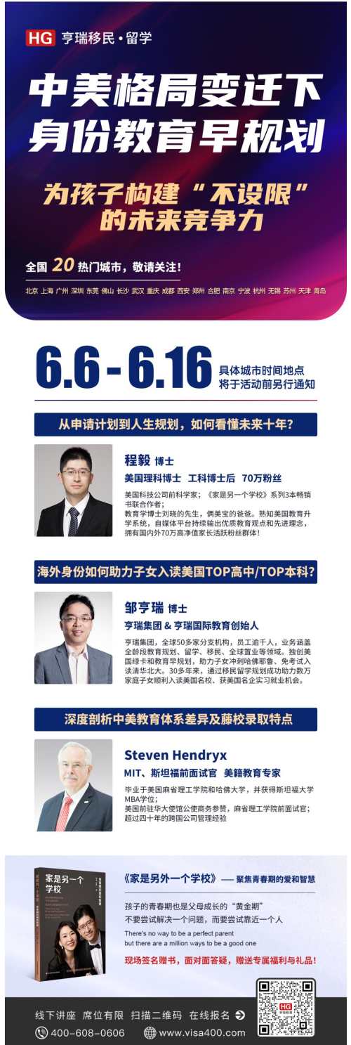首页 > 亨瑞服务 > 讲座活动 > 程博士全国20热门城市巡讲:中美格局变迁下身份教育早规划