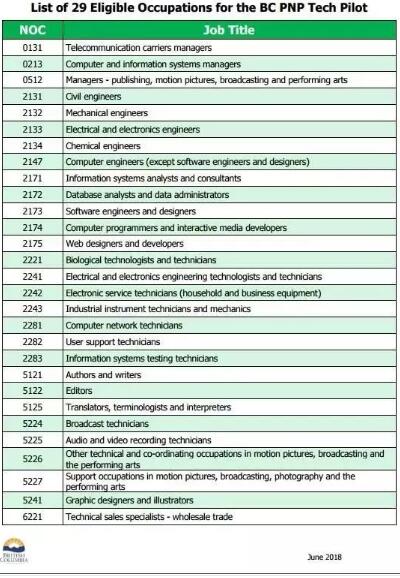 加拿大BC省技术移民试点项目是BC省省提名下雇主担保移民类中的一种类别,除了需要满足BC PNP的基本条件,申请人的职业还必须符合BC省科技试点的29个职业清单: