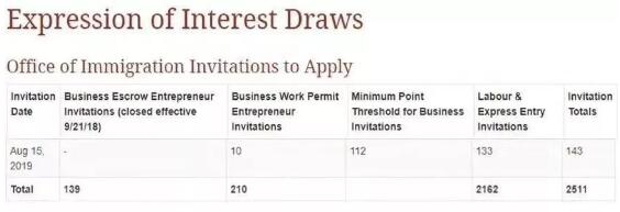阿尔伯塔省于2019年7月31日和8月7日两次发出AINPEE类省提名项目邀请,最低分获邀(CRS)分别是400和352分,共邀请354人。
