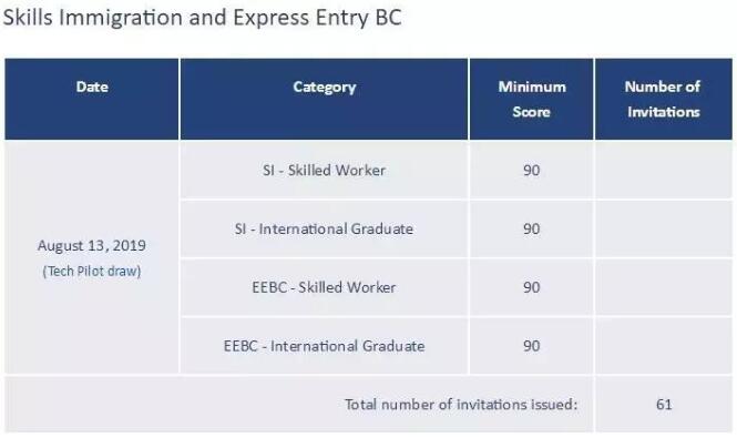加拿大当地时间2019年8月13日,BC省移民局公布最新一轮雇主担保移民项目筛选情况,本次获邀分数为90分,邀请人数61人。