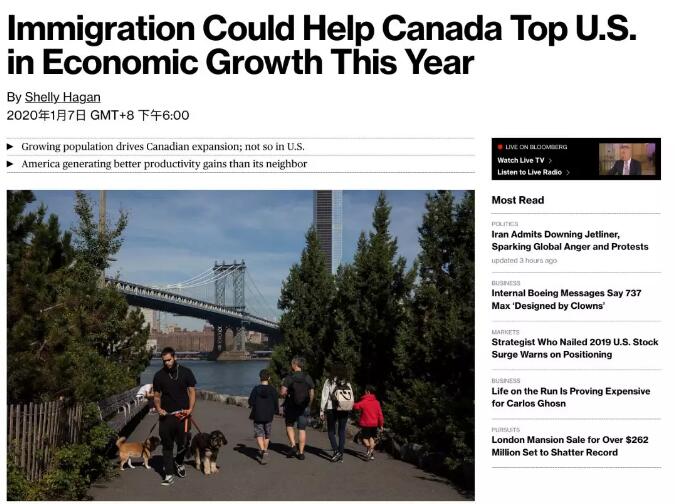 根据bloomberg所采访的经济学家,大部分认为美国将以1.8%的经济增长率领先加拿大的1.6%。但是,Montreal银行的首席经济学家Doug Porter却认为,加拿大的移民年均1.5%的人口增长率将使得加拿大的经济增长率轻松超越美国。