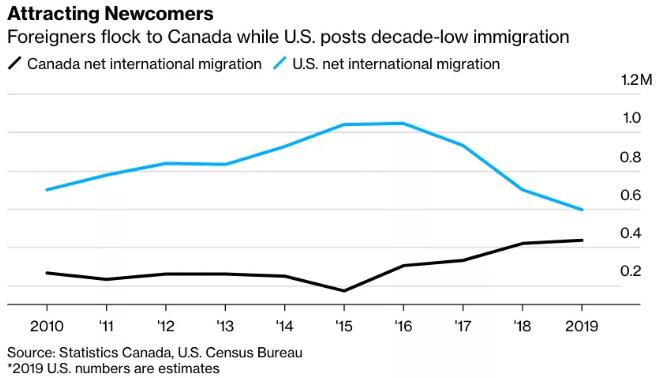 过去十年美加新移民对比:2019年,加拿大接受了43.7万新移民,使之实现了30年来最快的人口增长。反观美国,虽然人口基数庞大却仅仅接收了59.5万新移民,为近十年最低点。