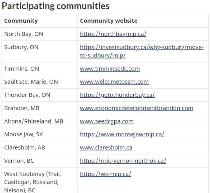 参与RNIP项目的有11个城市和地区,RNIP为在加拿大这些小城市中找到工作的新移民快速办理永久居民。