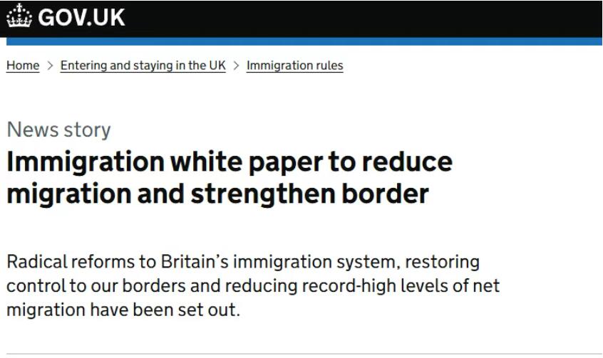 英国政府发布题为《恢复对移民体系的控制》的移民白皮书,文件长达82页,明确传递出一个核心信号——收紧移民、提高门槛、优先高技能人才。