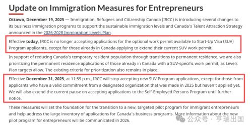加拿大移民、难民和公民部(IRCC)近日宣布,自 2025 年 12 月 31 日晚上 11:59 起,将关闭加拿大联邦创业移民(Start‑Up Visa, SUV)项目申请通道。此举标志着加拿大商业类移民项目的一次重大调整,也对计划通过 SUV 创业移民赴加的申请人产生直接影响。