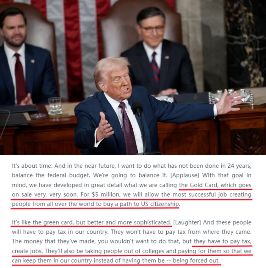 昨晚,川普在美国国会发表了长达近100分钟的“国情咨文”。在演讲中再次“兜售”500万美元“金卡”。