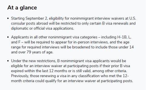 对于H-1B(工作签)、F-1(学生签)、L-1(跨国公司高管/专业技术人才签证)等类别的新签或续签者,新政基本取消了免面谈的可能性。