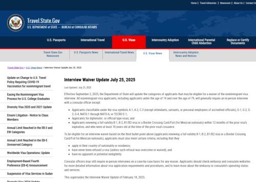 美国国务院新规指出:14岁以下和79岁以上申请人将不再享有免面试资格。