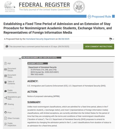 8月28日,美国国土安全部(DHS)在《联邦公告》上正式发布了关于留学生/访问学者身份期限的拟议规则,开启为期30天的公众意见征集期。