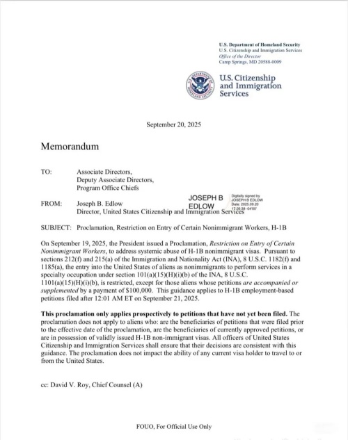 9月19日“H-1B要加收10万美元费用”的公告犹如投下一枚重磅炸弹,给H-1B和留学生群体造成了一片混乱。