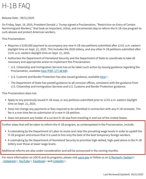 H-1B加收10万美金新政一波三折,继白宫新闻秘书Karoline Leavitt发文澄清之后,美国移民局9月21日发出“H-1B FAQ”。