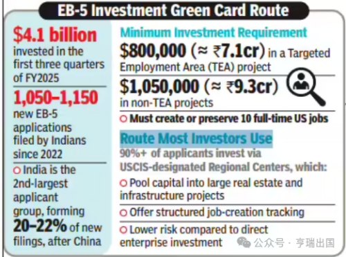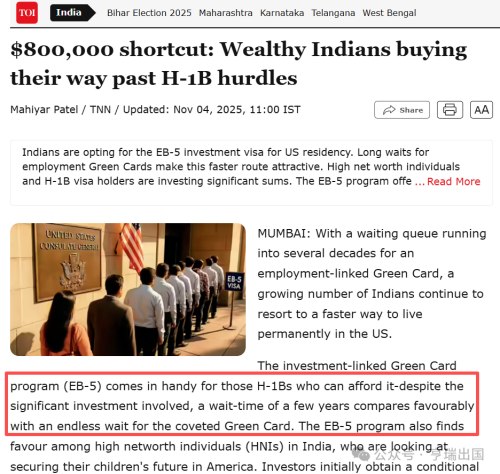 亨瑞小亨注意到,当地时间11月4日,《印度时报》报道,由于在美的印度 H-1B 家庭面临数十年的绿卡等待期,越来越多的印度人转向美国的EB-5投资移民绿卡途径(EB-5新政项目)——以寻求美国永久居留权。