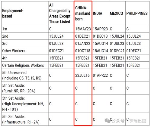 可喜的是,EB-5非预留出现220天的大幅前进,表B排期也小幅前进21天。EB-5新政继续保持无排期。而中国大陆职业移民表A也表现喜人,EB-1、EB-2、EB-3、EB-4 都有1到2个月幅度的前进,表B无变化。一起来看: