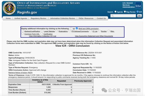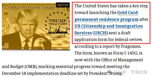 据 The Economic Times 11月20日报道,美国在启动金卡永久居民项目方面迈出了关键一步,此前美国公民及移民服务局(USCIS)提交了特朗普金卡的申请表 ——I-140G 表格,现已交由管理与预算办公室(OMB)处理,标志着金卡已朝着特朗普设定的 12 月 18 日实施截止日期取得了重要进展。