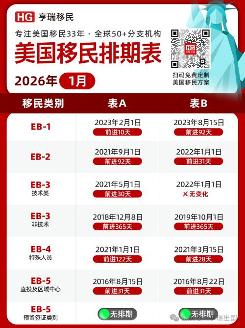 职业移民排期表A和表B均向前推进;EB-5非预留签证前进31天。新政的EB-5预留类别继续保持无排期状态,仍是当前投资移民中确定性最高的选择。