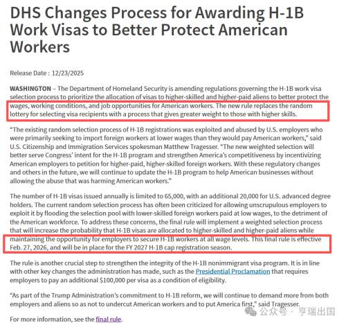 美国时间12月23日,美国国土安全部与美国公民及移民服务局正式确认H-1B工资加权抽签改革方案最终规则。