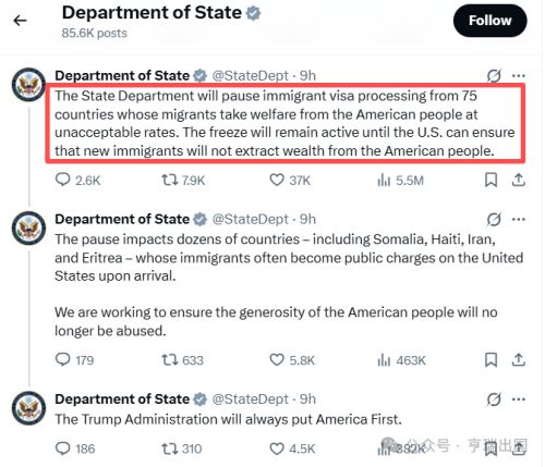 核心逻辑: 美国国务院称,这75个国家的移民在美国领取福利(如社保、医疗补助等)的比例“高到不可接受”。