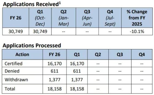 2026财年第一季度,PERM的申请量为30,749,对比2025财年第一季度下降了10.1%。已处理的申请中,通过率为96.3%。