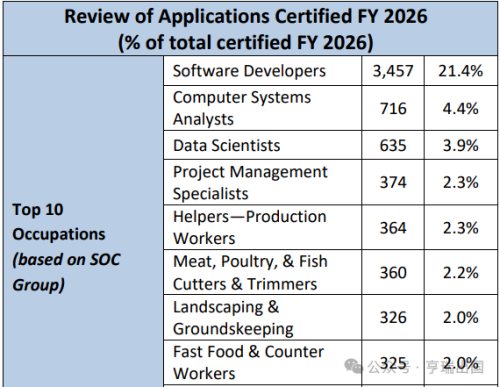在PERM申请的岗位中,“软件开发者”占21.4%,仍占据榜首。加上其他计算机相关职位,如计算机系统分析师(4.4%)、数据科学家(3.9%)等,科技类岗位仍占比很高。