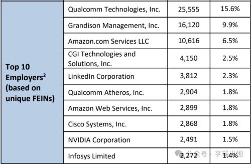 2026 财年Q1,高通以25,555份LCA申请跃居雇主榜首,其旗下子公司亦贡献了近3000份申请,医疗保健外包巨头Grandison Management、亚马逊紧随其后,LinkedIn、思科、英伟达等知名科技企业稳居前十。