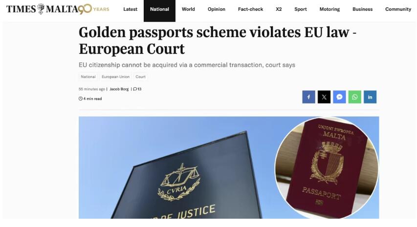 4月29日,欧洲法院就马耳他投资入籍诉讼案正式作出判决,认定马耳他 “黄金护照”计划违反欧盟法,特别是《欧盟运行条约》(TFUE)第20条和《欧盟条约》(TUE)第4条第3款的规定。这一裁决引发了广泛关注。