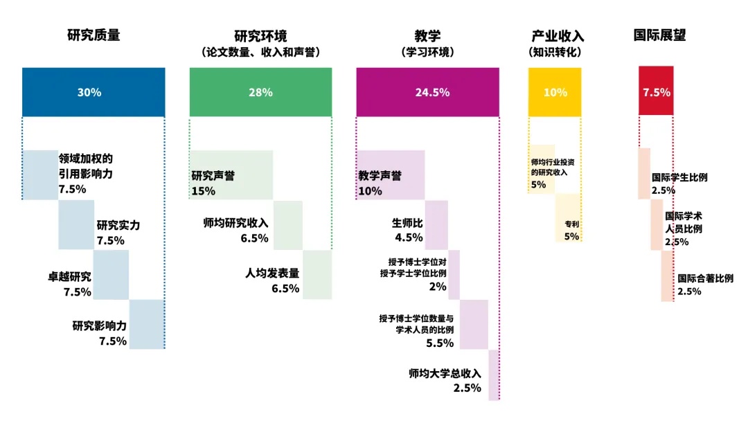 亚洲大学排名使用与世界大学相同的18个经仔细校准的绩效指标,同时,亚洲大学排名的权重经过专门调整,以准确反映亚洲大学的优先事项。其绩效指标分为5个领域,具体占比可见下图。