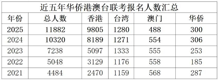 近几年,华侨生联考报考人数持续上涨。2023年人数共计7238人,考试人数首次破七千,同比增涨43%。2024年人数共计10320,同比增涨42.6%,正式破万!2025年人数共11882人,继续上涨!