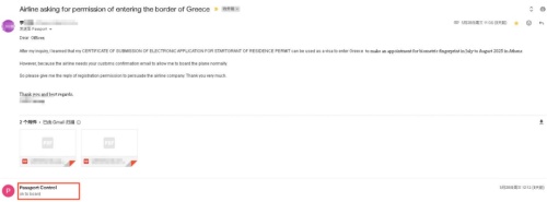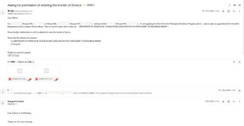 以下是亨瑞移民欧洲项目部李老师在客户出行前向希腊边检发出的入境准许的邮件申请:
