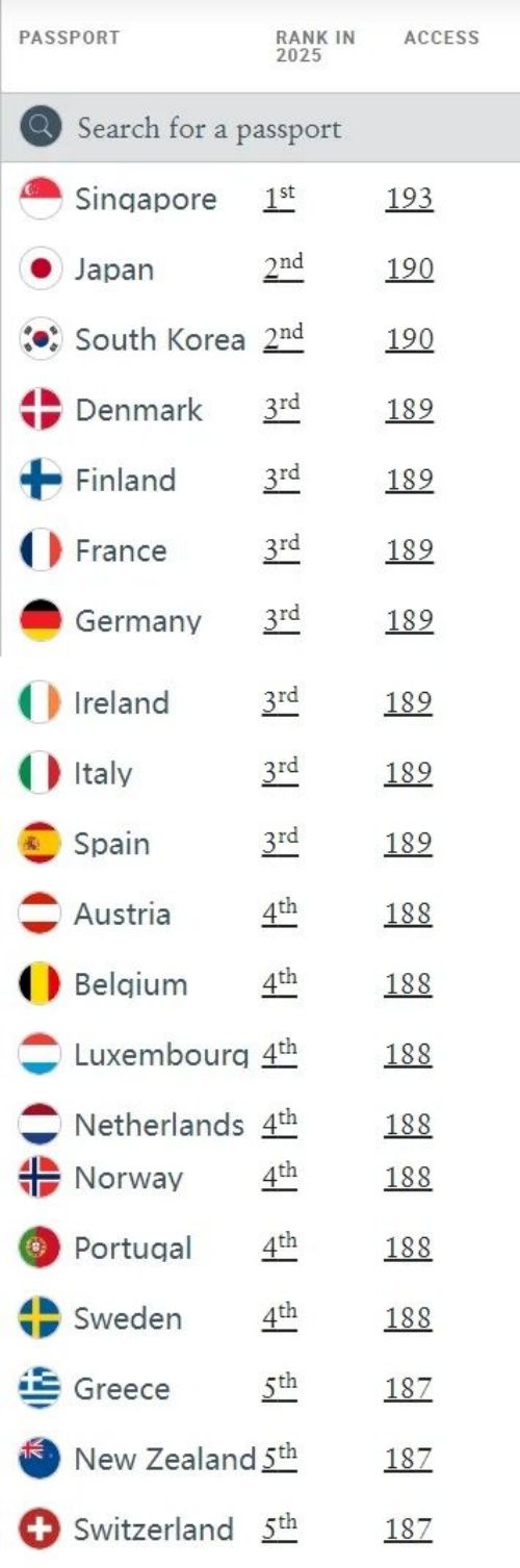 新加坡以193个免签或落地签目的地的成绩,连续第二年问鼎全球第一!紧随其后的是日本和韩国,两国的护照都能畅游190个目的地,稳坐第二名。