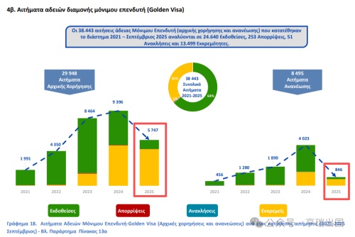 截至2025年9月,希腊黄金签证项目批准的有效永居卡中,首次申请获批的主申请人(投资人):26%;首次申请获批的附属申请人(家庭成员卡):51%;续签获批的主申请人(投资人):9%;续签获批的附属申请人(家庭成员卡):14%。