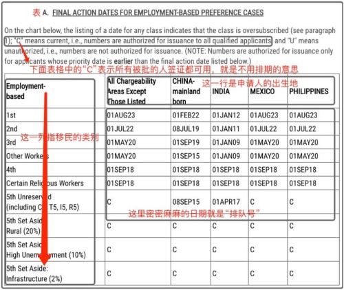 表A表示在表上日期之前的人已经有签证或绿卡可用,可以开始办理;