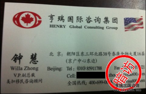 F-(满分10)材料:是否有材料及材料是否有帮助(得分:10) 一、机构位置:地铁10号线C2出口,步行500米左右。 ![]() 2. 机构环境 没有预约,被前台小姐领到了待客区,这是其他公司没有的。公司规模很大,北京分部就有三百多人,整个一层都是这家公司,整体办公环境宽敞明亮。 ![]() 3.机构服务 ![]() ![]() 4. 相关费用 ![]() ![]() 5. 相关资料(见图片) ![]() ![]() 二、顾问 1. 基本情况(名片信息) ![]() 这家公司比较领先,几乎所有的东西都用数字化管理模式。别的公司都是咨询室,这家公司是办公室对话,一个顾问一个办公室,顾问用电脑把客户需要的的东西直接反映到显示到大显示屏上,比较新颖,也比较客观。而且顾问还专门提到,该公司的所有业务都可以在该公司的网上查到。 2、服务态度:前台引导及时,顾问效率比较高,给客户的建议很清晰,具有可信度。客人有咖啡,还有温水。 3、是否有夸大或欺骗:分析完我的情况,这位顾问也是一下就推荐了美国EB5投资移民项目。业务很熟练,各种利弊讲的很清楚。 4、仪表着装:正规,黑色职业西装。 5、是否有常识性错误:未见。 亮点: 1、业务广泛,公司规模大,成绩斐然。 2、提供咖啡,很温馨 3、顾问带着我参观了一下公司的全貌,让人对这家公司很有信心。 4、数字管理系统,一切都摆在眼前,简单明了。 5、顾问的态度很和善,加拿大籍,对自己介绍的地方很熟悉。 |