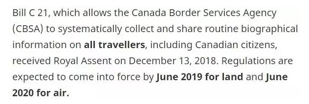 6月开始,经陆路从加拿大到美国,CBSA依法将与美国海关及边境保护局(U.S. Customs and Border Protection)交换旅客讯息,并将交换讯息的对象则扩大至包括加拿大公民在内。