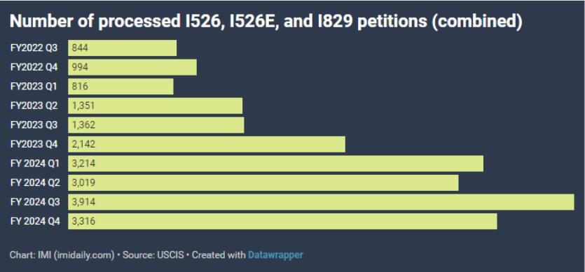 2024财年第四季度,递交I-526申请数量比第三季度增长了350%。