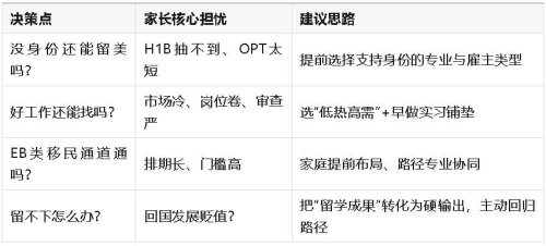 典型问题:海归身份在国内真的还有竞争力吗?如果最终无法留美,留学的价值是否打了折扣?孩子怕回国没落脚点,怎么办?