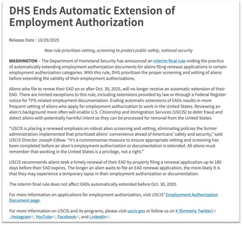 美国国土安全部(DHS)10月29日突然宣布:从2025年10月30日起,EAD工卡将不再享有自动延长机制。