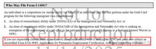金卡可以申请的人群:可选择EB-1或EB-2的NIW申请,如果申请被归类为NIW,还需递交ETA-9089表: