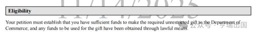 您的申请必须证明您有足够的资金向商务部进行无限制的捐赠;并且用于捐赠的资金是通过合法途径获得的。