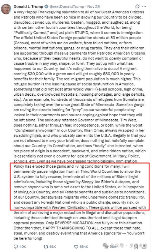 “我将永久暂停来自所有第三世界国家的移民,让美国体系得以完全恢复。清除所有不能为美国创造净价值或无法热爱我们国家的人员,终止向非本国公民提供的一切联邦福利与补贴,对破坏国内安宁的移民撤销其(美国)国籍,驱逐任何构成公共负担、安全风险或与西方文明不相容的外国人。”