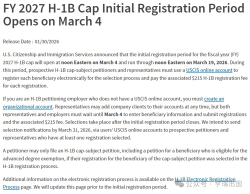 美国移民局已正式确认:2026财年H-1B抽签类签证网上电子注册将于美东时间3月4日中午12:00开启,并在3月19日中午12:00截止。