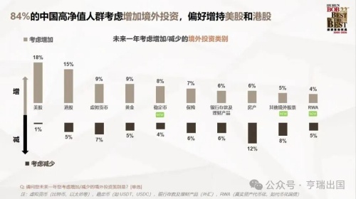 境外投资净增长意向7%,其中美股和港股成为首选。基金与保险净增长意向均为6%。对高波动性资产的兴趣明显趋于保守,房地产、艺术品与收藏品则面临减持。