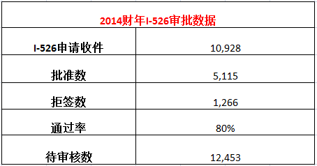 美国移民局官方网站数据显示:2014财年全年I-526申请收件10,928份,批准5,115件,拒签1,266件,通过率80%,累积待审核12,453件。I-829申请收件2,516份,批准1,603件,拒签178份,累积待审核2075件,通过率90%。同去年相比,I-526和I-829通过率基本持平,且保持高位,这说明美国移民局的审理审批并未受到外在各类因素影响。