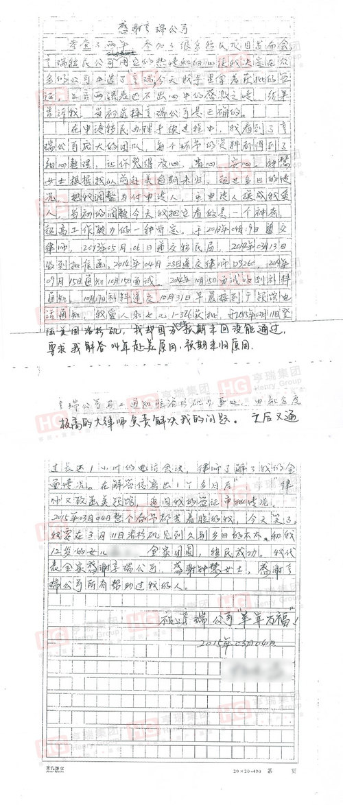 今天(2015年3月4日),怀着喜悦心情的客户杨先生为感谢亨瑞集团提供的专业周到的移民服务,特别是帮助其成功解决了面试难题并最终顺利获得美国移民签证,专程来到亨瑞集团北京总部送上手写的感谢信表达谢意。