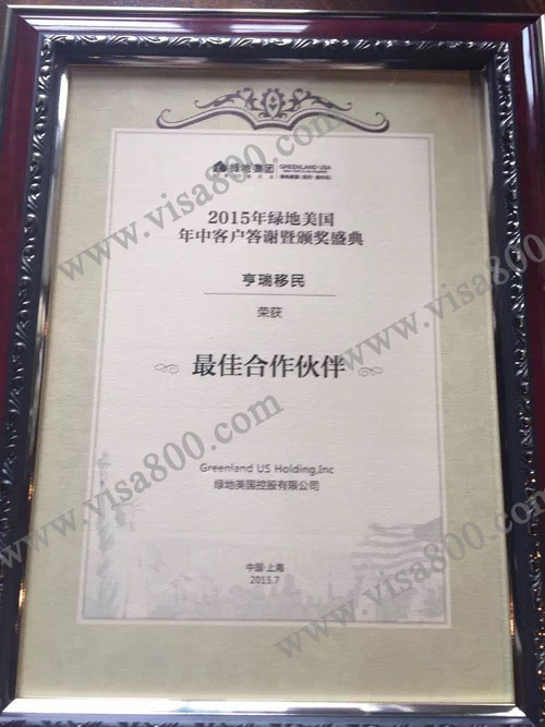 2015年7月26日,2015绿地美国年中业主答谢暨颁奖盛典在上海外滩盛大召开,来自社会各个领域的精英人士,因为一个共同的 “美国梦”相聚一起。作为绿地集团首个美国洛杉矶市中心高端商务酒店项目暨绿地集团美国EB-5投资移民项目的官方合作伙伴--亨瑞集团受到邀请,华东市场总监沈岭女士代表公司出席本次盛会并捧回绿地集团“最佳合作伙伴奖”。