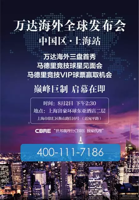 由世邦魏理仕CBRE独家代理、与亨瑞集团鼎力合作的“2015 万达海外 三盘共耀 对语全球”发布会将有西甲劲旅马德里竞技当家球星现场助阵。参与当天的发布会,就有机会获得球星签名足球,更有机会与球星合影互动。