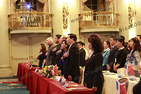 部分参会嘉宾合影(前排):中美企业峰会主席沈群(左一)、美国国会众议员赵美心(左二)、美国共和党著名领导人布鲁斯·汤普森(左四)