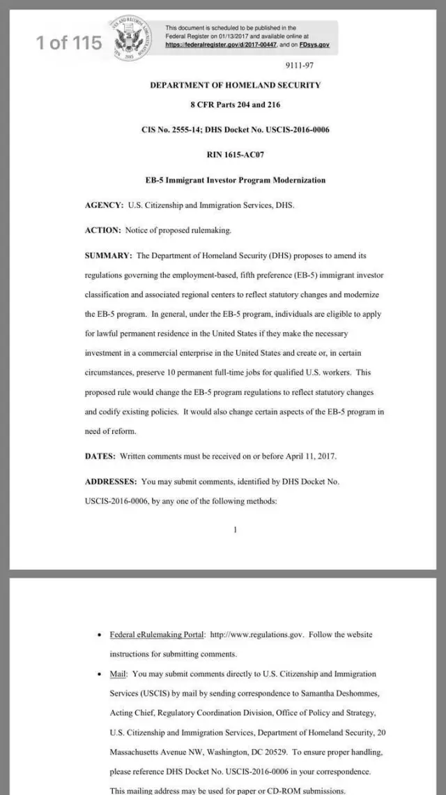 美国时间,12日早上8:45分,移民局的EB-5改革,名为:EB-5 Immigrant Investor Program Modernization(EB-5投资移民现代化)